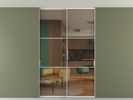 Алюминиевые перегородки имеют единый профиль с алюминиевыми дверьми и легко сочетаются в одном пространстве, не перегружая его. Также их можно комбинировать в интерьере с полотнами из нашего стандартного ассортимента. Помимо этого, система алюминиевых перегородок и дверей координируется со стеновыми панелями Волховец.